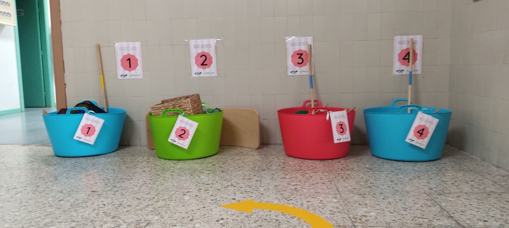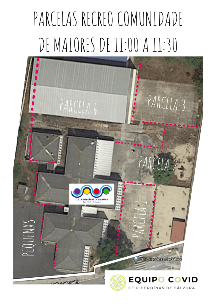 Unha novidade deste diferente ano son as parcelas do patio. Por culpa do protocolo Covid o patio está dividido en catro partes. Nesas catro zonas están cada unha das parcelas nas que se divide o patio. En cada parcela hai un capacho con xogos diversos para cada zona.